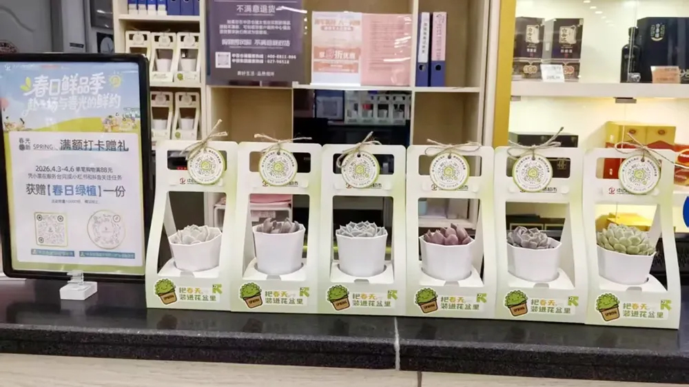 其中,“春光好物清单”店内打卡赠活动内容新、互动强、延展性丰富,吸引消费者积极参与、拍照打卡,进一步提升现场客流。春日多肉绿植在门店服务台、收银出口专区陈列,活动看板美观醒目,“小清新”春日形象跃然呈现。